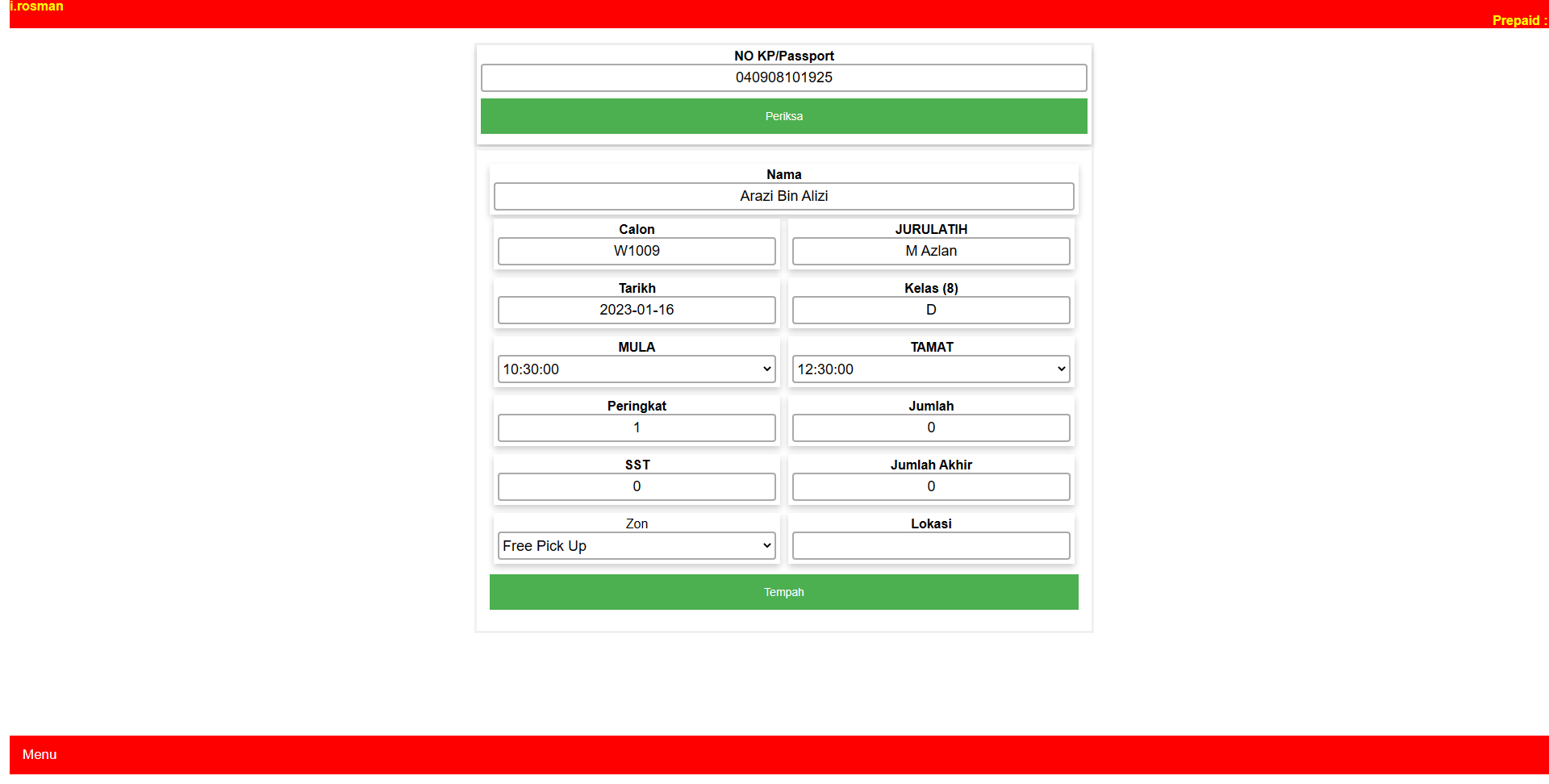 Skrin ini bertujuan untuk tempahan jadual berdasarkan slot yang kosong