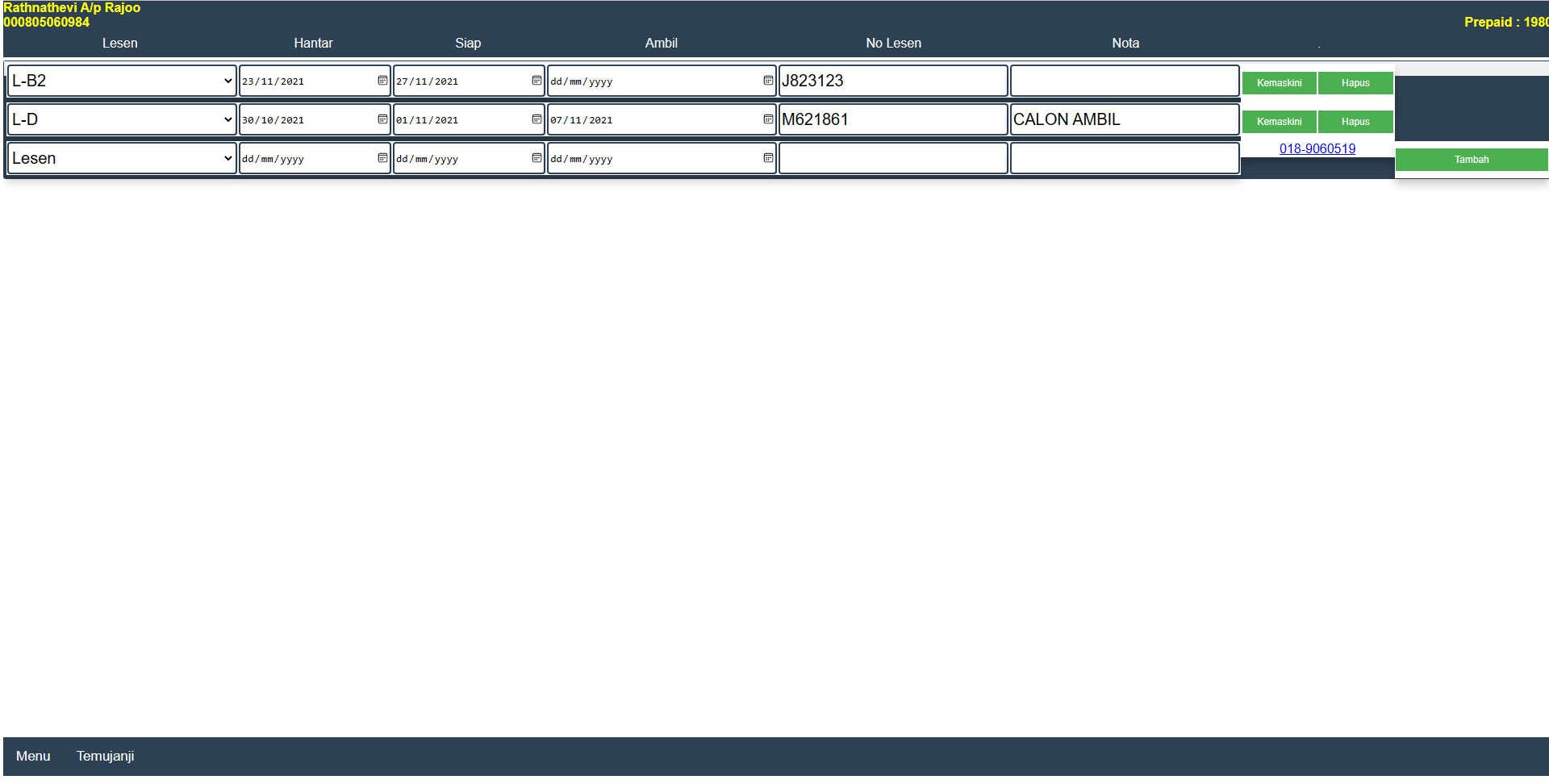 Skrin ini memaparkan rekod lesen yang di isu kepada calon
