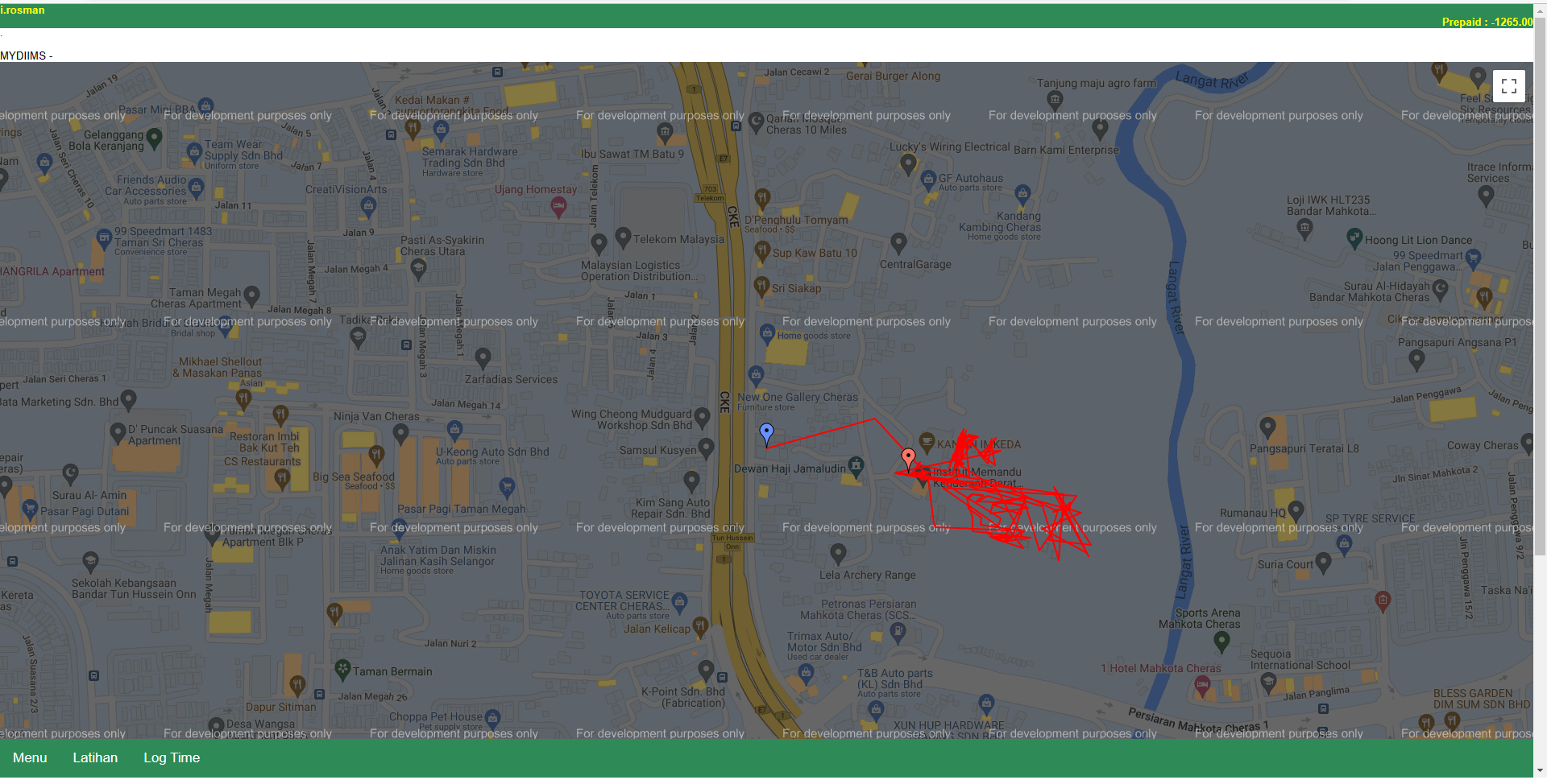 Skrin ini memaparkan peta perjalan kenderaan latihan