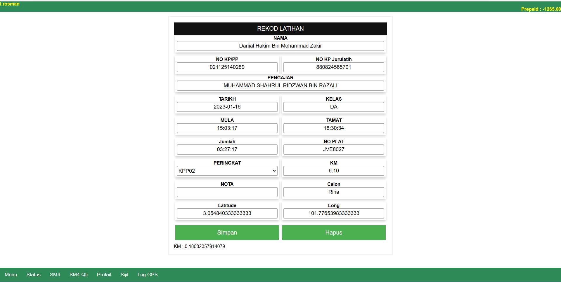 Skrin ini memaparkan maklumat lengkap latihan calon.
