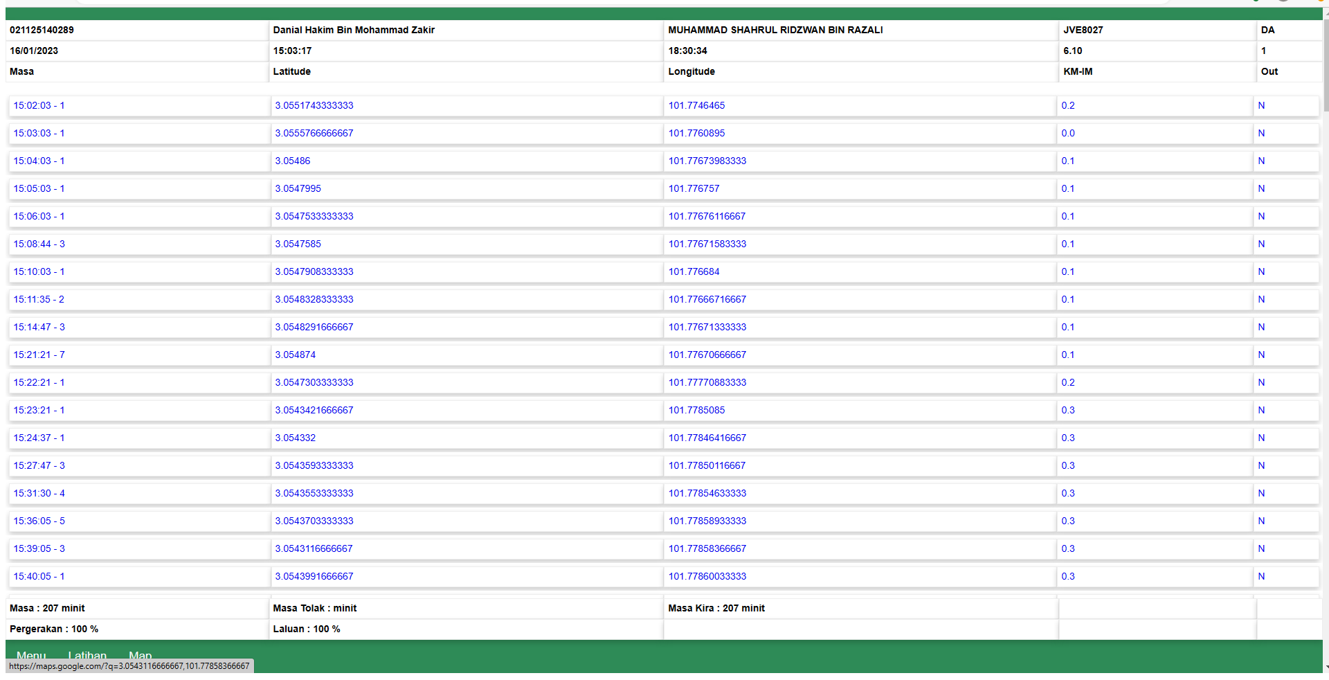Laluan : Mengira sama ada latihan tersebut mengikut laluan ujianJPJ (Tiada penolakan masa).