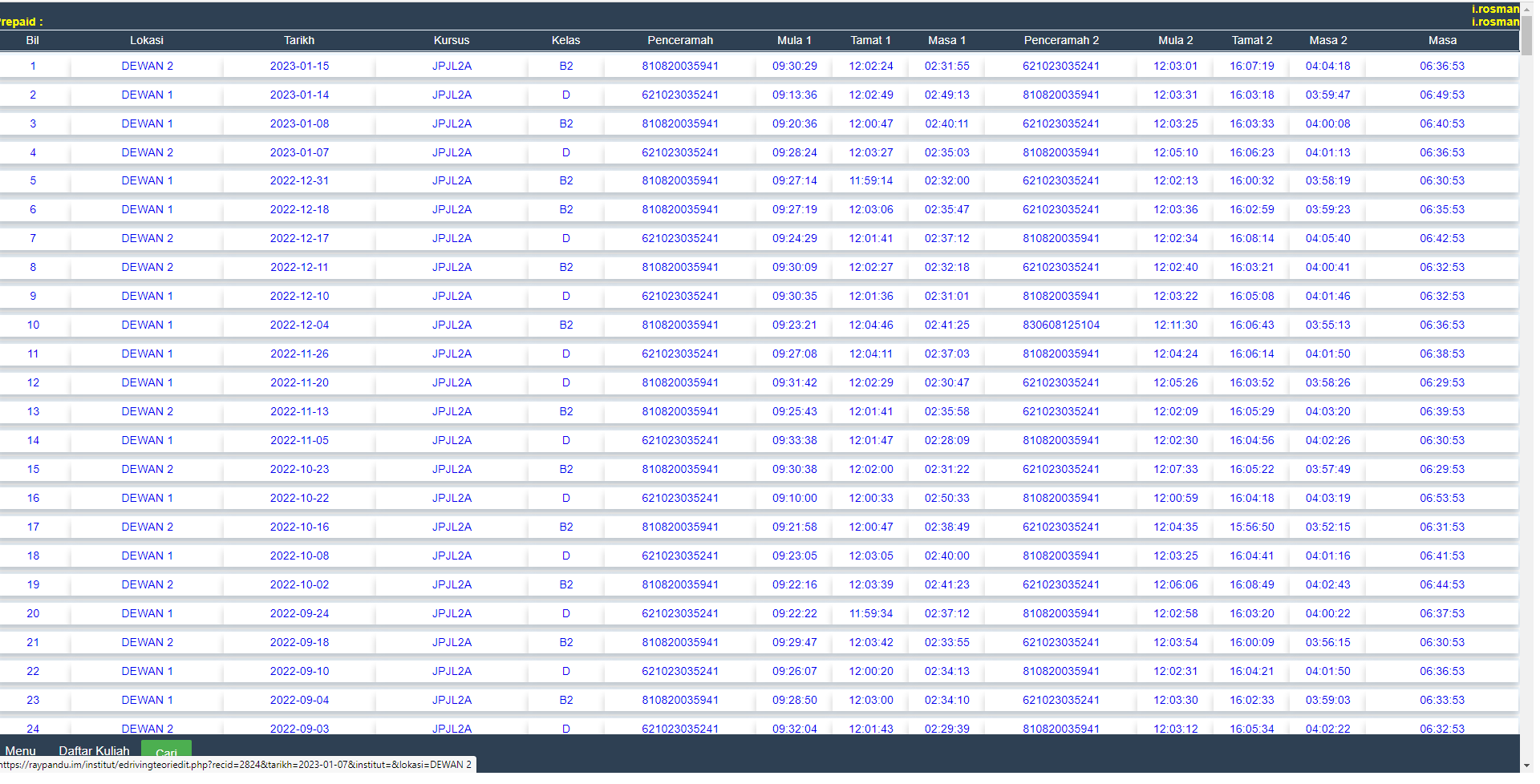 Skrin Ini memaparkan Rekod Kehadiran Ceramah E-Driving