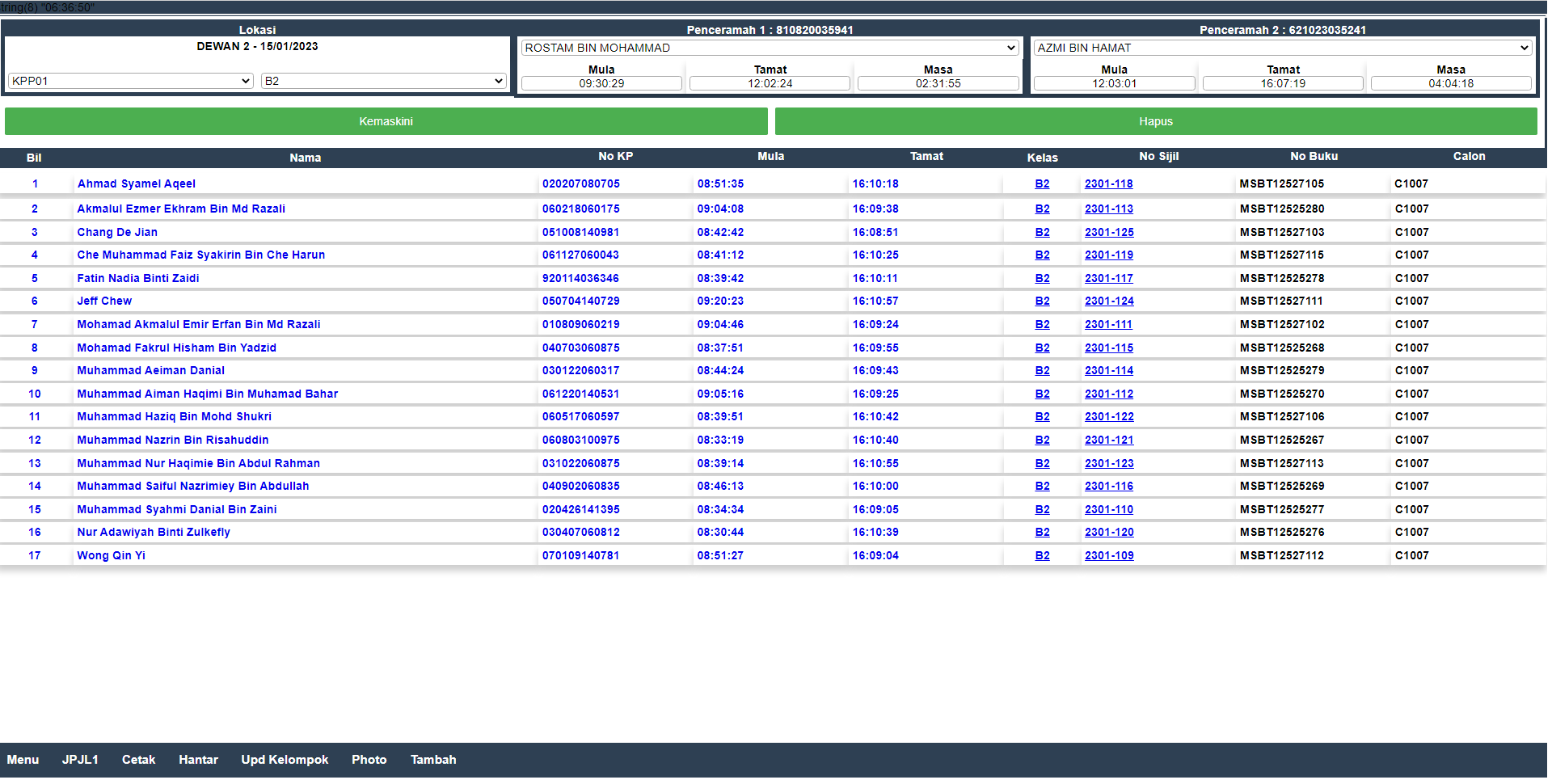 Pengguna boleh melengkapan maklumat kursus seperti No Buku dan Kelas jika berlaku kesilapan data entry.