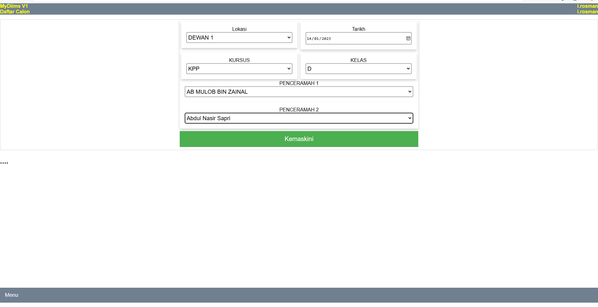 Skrin ni digunakan untuk mendaftar bilik Ceramah setiap hari kursus.